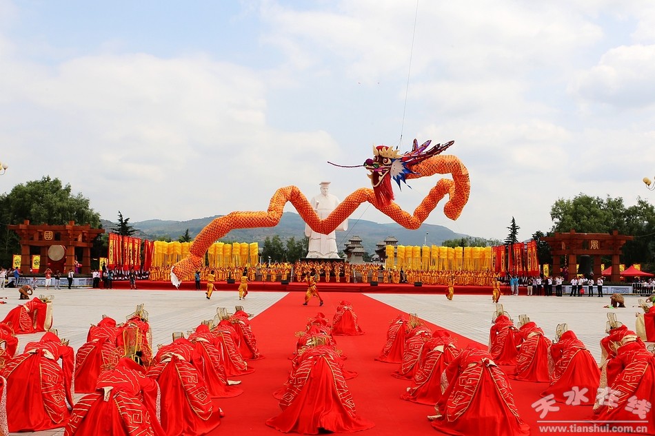 天水市委副書記、市長(zhǎng)王軍恭讀祭文;出席祭祀典禮的省、市領(lǐng)導(dǎo)向中華人文初祖軒轅黃帝敬獻(xiàn)花籃;所有來賓面向軒轅黃帝圣像,行三鞠躬禮;來自清水縣軒轅小學(xué)的200多名學(xué)生深情演唱了《黃帝頌》;由89名女青年組成的《樂舞敬拜》,以漢唐風(fēng)格舞蹈語匯為主,貫穿禮、祭、拜、頌四部分,舞蹈舒緩大氣,場(chǎng)面宏大壯觀,氣氛莊嚴(yán)肅穆,感情虔誠崇敬,用唯美的意境展現(xiàn)對(duì)先祖的敬畏,表達(dá)了對(duì)人文初祖軒轅黃帝的追思和敬仰之情。還表演了陣容龐大、氣勢(shì)恢宏的清水《軒轅鼓舞》,《軒轅鼓舞》由黃帝開國(guó)、先民生存、萬邦和睦三部分組成,采用清水民間世代流傳的鼓點(diǎn)韻律和舞蹈語言,通過豪邁奔放、簡(jiǎn)潔明快的藝術(shù)表演,闡述軒轅文化“敢于斗爭(zhēng),勇于創(chuàng)造,自強(qiáng)不息”的精神內(nèi)涵,是清水人民對(duì)軒轅黃帝出生清水軒轅谷、發(fā)跡清水軒轅溪、創(chuàng)造人類福祉的深情緬懷和崇高禮贊。祭祀典禮在《巨龍騰飛》中結(jié)束,共同祝愿清水騰飛、天水騰飛、甘肅騰飛、中華騰飛。