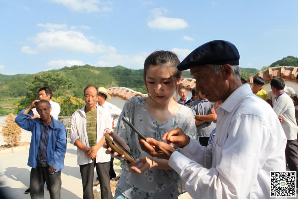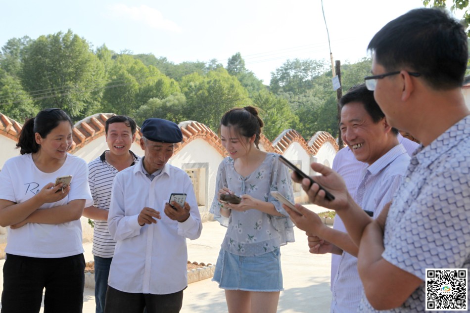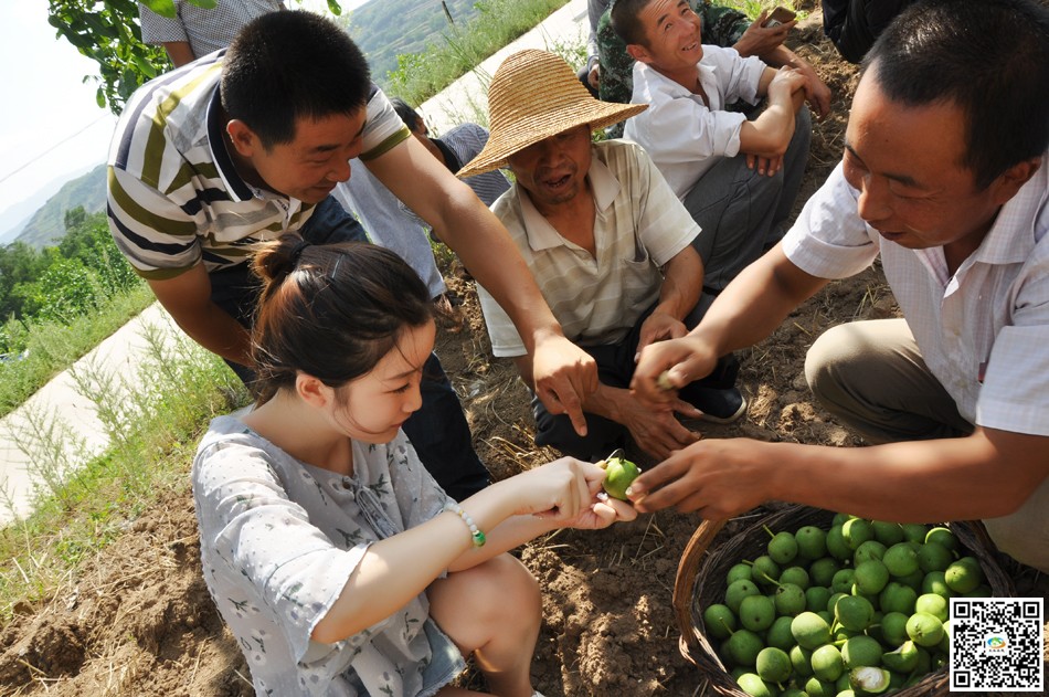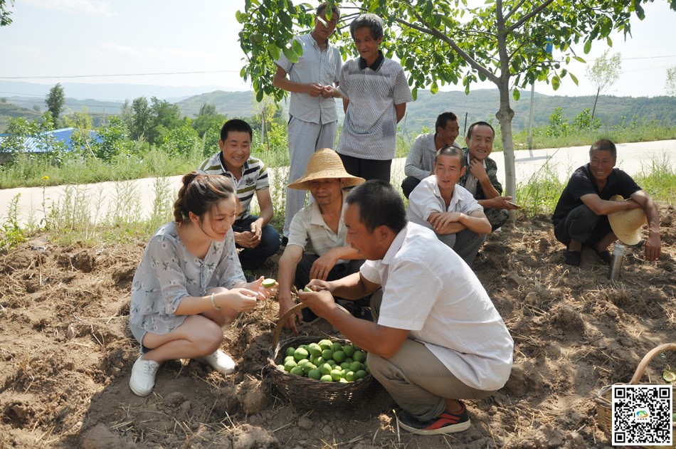 ▲圖為天水在線小編在田間地頭為秦亭村村民講解微信直銷自家青皮核桃的方法