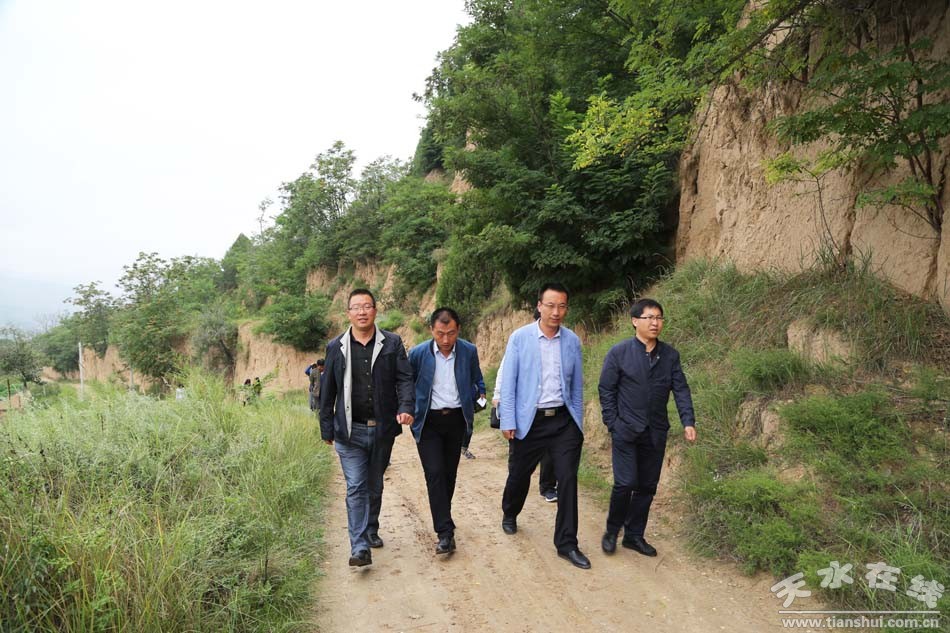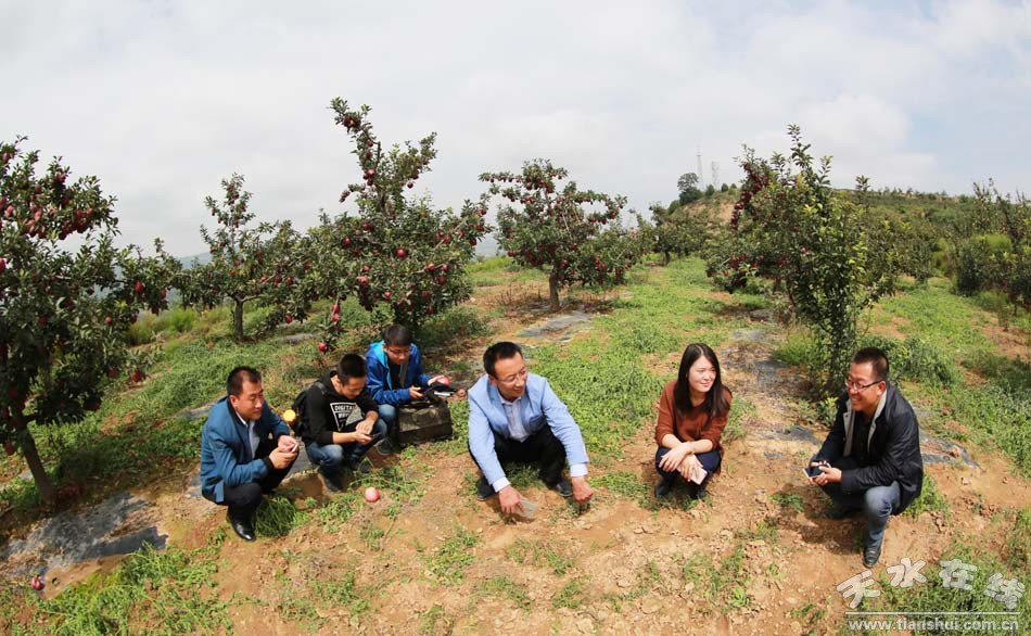 。ㄇ逅h商務(wù)局局長(zhǎng)張偉,郭川鎮(zhèn)黨委書(shū)記李赟、鎮(zhèn)長(zhǎng)王小軍和天水在線(xiàn)一行走進(jìn)宋川村蘋(píng)果園,查看蘋(píng)果長(zhǎng)勢(shì),商定“宋川村果農(nóng)微信直銷(xiāo)自家花牛蘋(píng)果”事宜。)