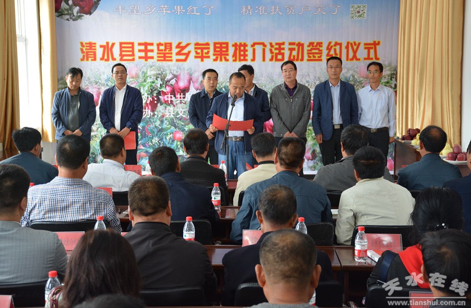 9月15日,清水縣豐望鄉(xiāng)舉行蘋果推介簽約儀式。清水縣委副書記王新強(qiáng),縣政府副縣長王懷珍出席簽約儀式;副縣長馬小平主持簽約儀式。天水花牛蘋果集團(tuán)有限公司、北京新發(fā)地明輝果業(yè)、秦安縣盈動果業(yè)、鄭州萬邦農(nóng)之果商貿(mào)有限公司等15家企業(yè)和農(nóng)民專業(yè)合作社負(fù)責(zé)人,豐望鄉(xiāng)幫扶單位、市縣新聞媒體、豐望鄉(xiāng)兩級干部參加了簽約儀式。