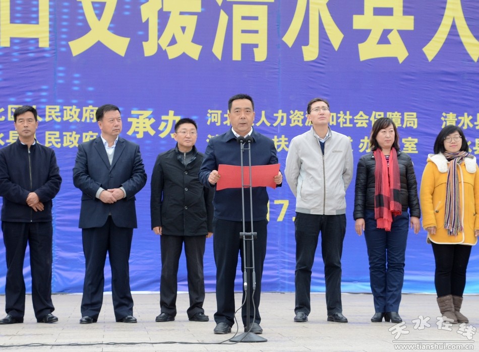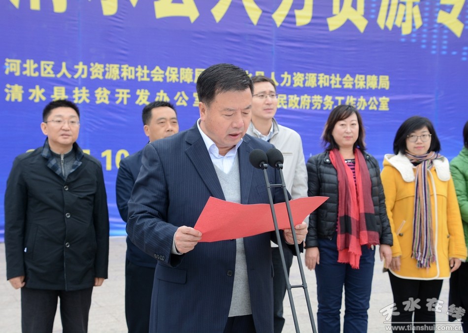 招聘會上,天津市河北區(qū)人社局副局長陳勇作了講話;清水縣委副書記王新強(qiáng)作了講話;縣委副書記仇金虎作了致辭;縣人社局局長趙升介紹有關(guān)情況。