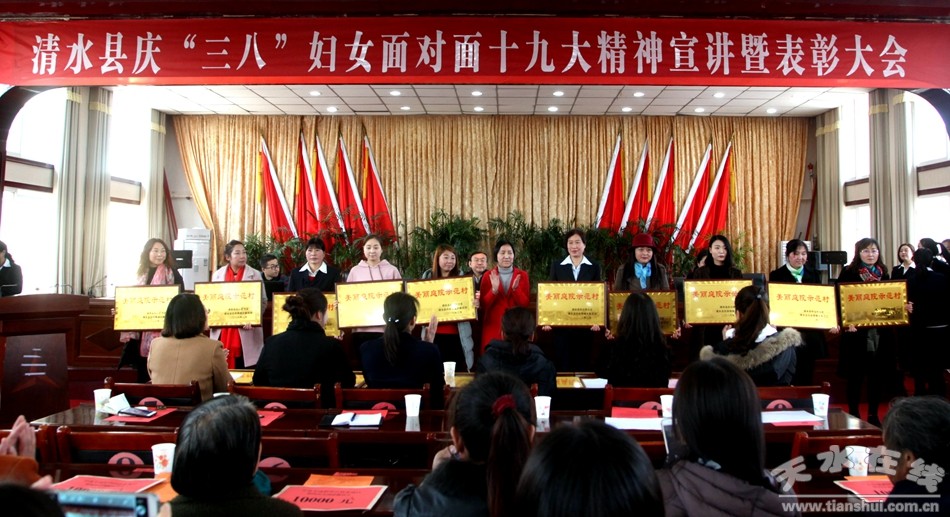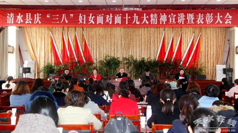 3月7日上午,清水縣慶“三八”婦女面對面十九大精神宣講暨表彰大會召開?h人大常委會副主任畢德祥、縣政府副縣長張軍、縣政協(xié)副主席曹鳳娥出席會議;18鄉(xiāng)鎮(zhèn)婦聯(lián)主席、副主席,部分貧困村婦聯(lián)主席、縣直機關(guān)女職工代表、愛到表彰的先進集體及個人代表參加了會議。