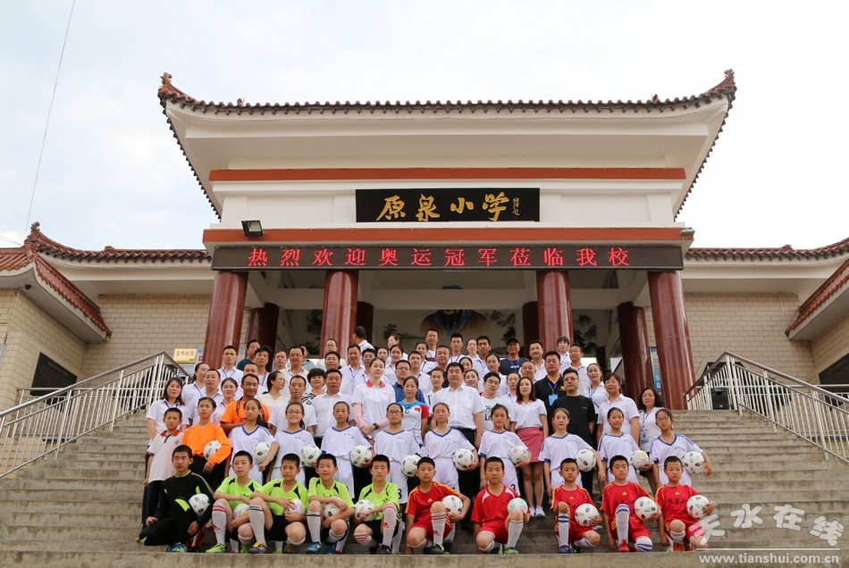 (奧運(yùn)冠軍在原泉小學(xué)合影留念)