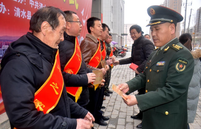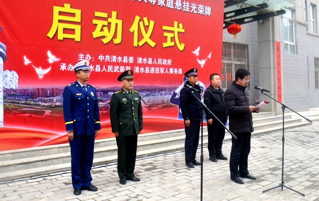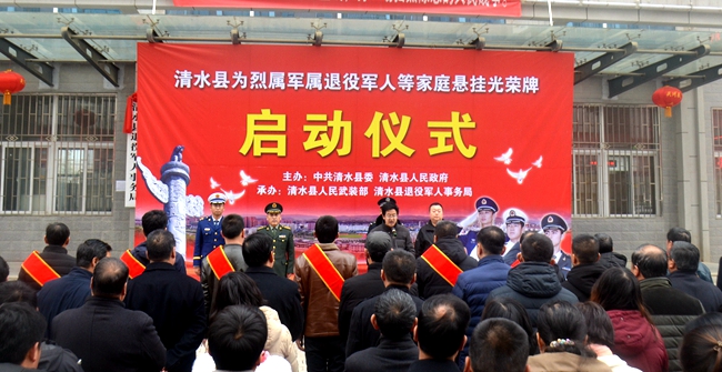 2月28日,清水縣舉行烈屬軍屬退役軍人家庭懸掛光榮牌啟動儀式?h委常委、人武部部長張玉賢,副縣長張軍出席啟動儀式,各鄉(xiāng)鎮(zhèn)分管領(lǐng)導(dǎo),縣雙擁領(lǐng)導(dǎo)小組成員單位部分干部職工,駐地部隊(duì)代表和退役軍人代表約100余人參加啟動儀式。