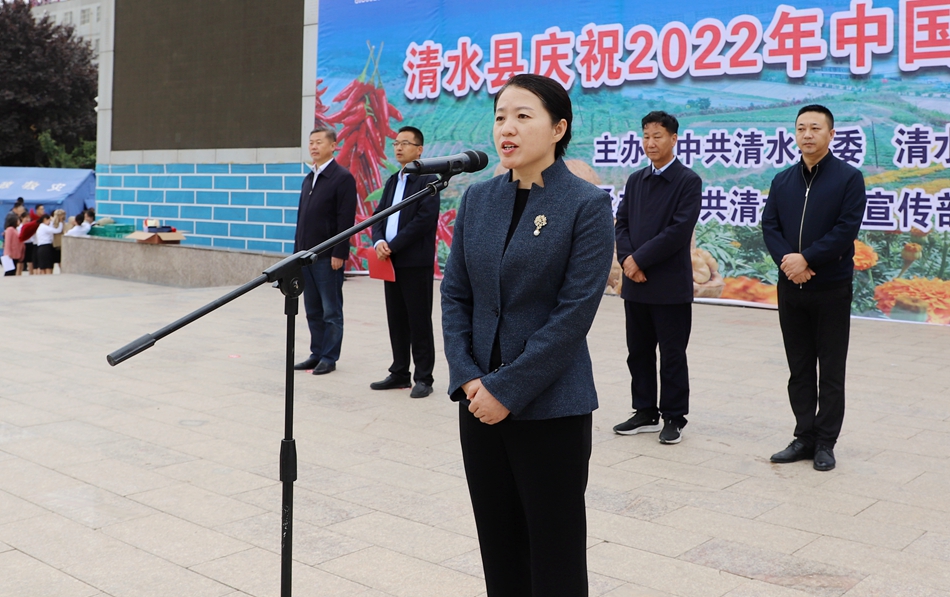清水縣委副書記、縣長李菊霞宣布清水縣“慶豐收、迎盛會”2022年農(nóng)民豐收節(jié)現(xiàn)場慶;顒娱_始。