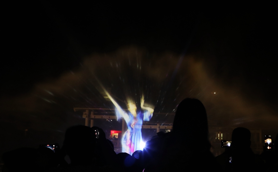 水幕與夜色融為一體,熒幕上的影像鮮活靈動、夢幻縹緲,將夜晚的軒轅湖映襯的更加出彩,吸引了眾多市民和游客打卡拍照。