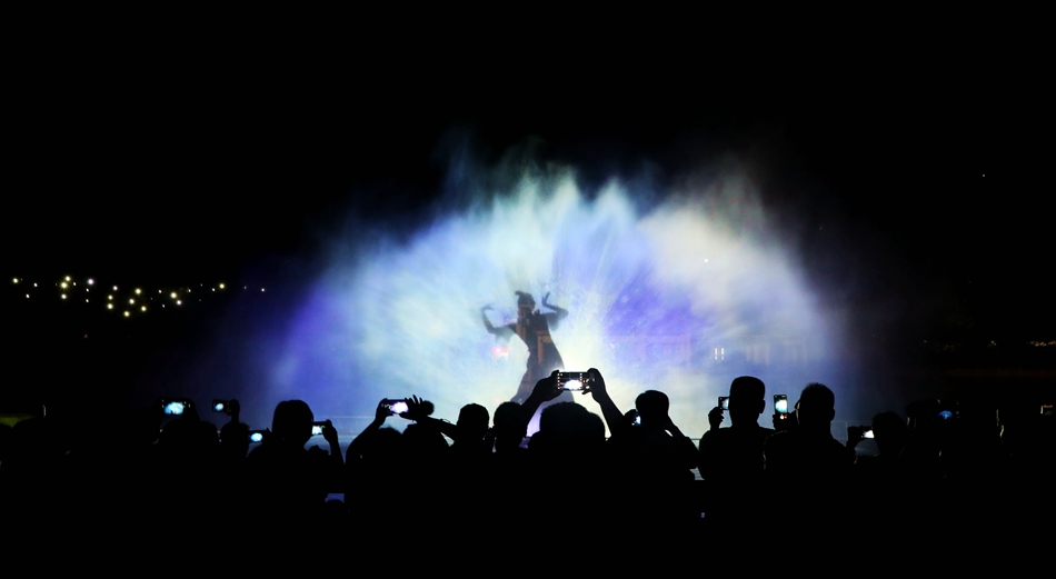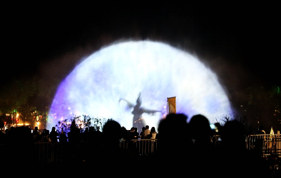 隨著音樂響起,組成水幕的水柱緩緩噴出,無數(shù)涓涌細(xì)流組合成一塊巨大的熒幕。每一束水柱都隨著樂曲舞動,組合成一幅幅夢幻唯美的景象,或演繹梁祝翩翩起舞的化蝶情景,或展示迎風(fēng)飄揚(yáng)的紅旗,亦或呈現(xiàn)軒轅文化等本土文化內(nèi)容……