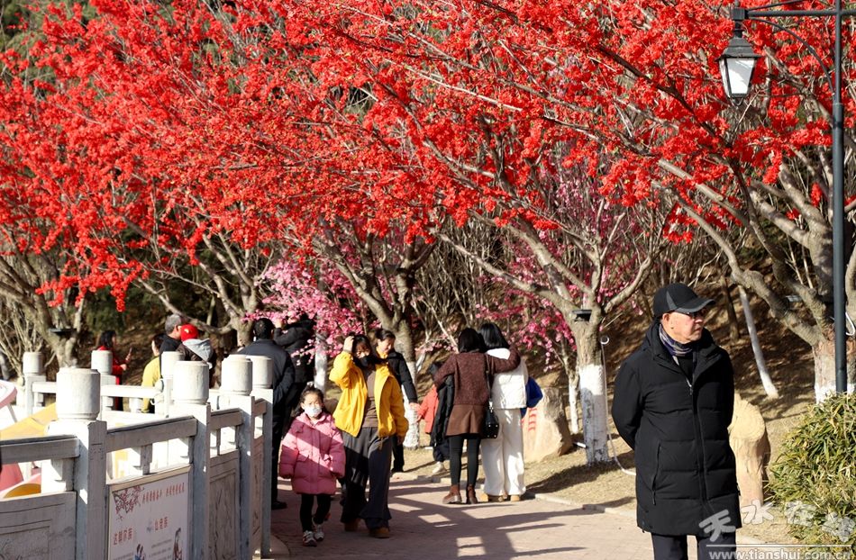 軒轅湖公園內(nèi),冬日的景致因節(jié)慶布置煥發(fā)出別樣生機。沿湖的樹木上,粉色桃花、艷紅梅花錯落綻放,與金黃的柿子造型、紅彤彤的燈籠交相輝映,一串串燈籠垂掛枝頭,隨風(fēng)輕晃,光影流轉(zhuǎn)間滿是吉祥寓意。