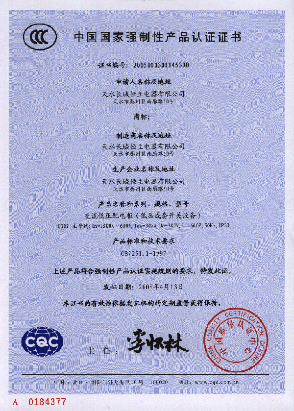 天水長城恒立電器有限公司獲得ISO9001:2000認(rèn)證及產(chǎn)品3C認(rèn)證