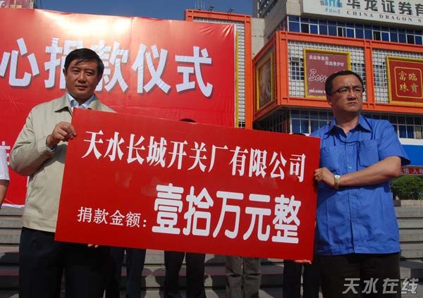 天水長城開關(guān)廠公司繼5月16日捐款10萬元后,公司黨委又組織全公司員工開展了愛心捐款活動。愛心活動中,公司領(lǐng)導(dǎo)、黨員干部積極帶頭捐款,公司領(lǐng)導(dǎo)捐款額達1500元以上、兩位主要領(lǐng)導(dǎo)捐款2000元,黨員捐款額達100元以上,中層管理干部捐款額達200元以上,員工捐款額達50元以上,在短短的一天時間內(nèi),公司全體員工共捐款156195元并于5月19日捐贈進入了全國捐贈專用帳號。目前,公司為地震災(zāi)區(qū)共捐款256195元。