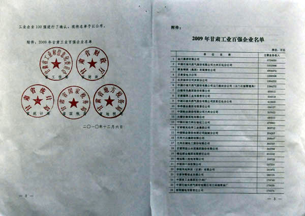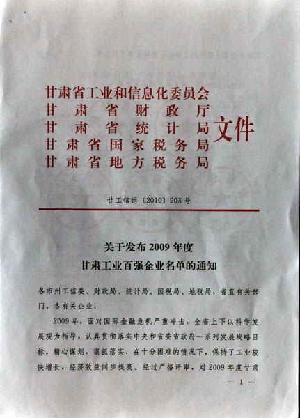 12月6日,由甘肅省工業(yè)和信息化委員會、甘肅省財(cái)政廳、甘肅省統(tǒng)計(jì)局、甘肅省國家稅務(wù)局和甘肅省地方稅務(wù)局聯(lián)合發(fā)文,對評審出的2009年度甘肅省工業(yè)企業(yè)100強(qiáng)進(jìn)行確認(rèn)并公布名單,蘭州長城電工股份有限公司榜上有名,位列第十七位。
