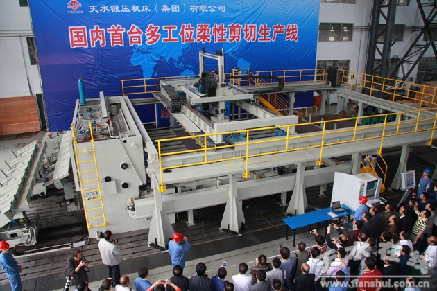 天水鍛壓機床(集團)有限公司于2013年5月自主研發(fā)生產完成ZS-QD11K—16×6200多工位柔性數控金屬板材自動剪切生產線,成為國內該類型首臺生產線,首臺生產線被北車集團購買使用,該生產線并被鑒定為具有國際先進水平的科技成果和新產品。該生產線具有加工精度高、自動化程度高、工作效率高、加工能力強、應用范圍廣的特點,其可對厚達16毫米、長6200毫米、寬2150毫米的碳鋼、耐候鋼、不銹鋼、高強度鋼和鋁合金等金屬板材進行自動化、高精度的四邊剪切,剪切精度達到國家最高標準精度等級,工作效率是傳統(tǒng)剪切設備的2至3倍。該生產線廣泛應用于軌道交通、高鐵、汽車、船舶、制管、鋼結構等行業(yè),作為高精度、高效率的金屬板材直線冷剪切通用設備使用。ZS-QD11K—16×6200多工位柔性數控金屬板材自動剪切生產線項目的研制完成,也打破了德國在該產品技術領域的壟斷地位,對天水鍛壓集團引領剪切機床行業(yè)尖端技術、占據國內主導地位和開拓國際市場打下了堅實基礎。