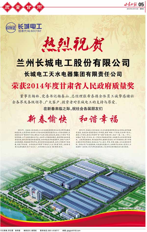 長(zhǎng)城電工天電集團(tuán)榮獲2014年度甘肅省政府質(zhì)