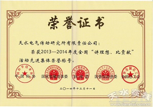 近日,由中國科協(xié)、發(fā)展改革委、科技部、國務(wù)院國資委、全國總工會共同舉辦的“中國科協(xié)會員日暨表彰大會”在北京人民大會堂召開,大會對全國2013-2014年在講理想、比貢獻(xiàn)活動中的先進(jìn)集體、創(chuàng)新標(biāo)兵等進(jìn)行了表彰。長城電工天水電氣傳動研究所有限責(zé)任公司榮獲了“講理想、比貢獻(xiàn)”先進(jìn)集體榮譽(yù)稱號。