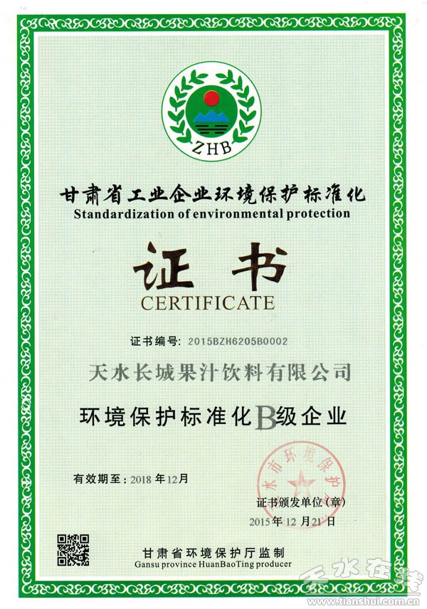 根據(jù)《甘肅省人民政府辦公廳轉(zhuǎn)發(fā)省環(huán)保廳關(guān)于開(kāi)展工業(yè)企業(yè)環(huán)境保護(hù)標(biāo)準(zhǔn)化建設(shè)工作實(shí)施意見(jiàn)的通知》和省環(huán)保廳、省發(fā)展改革委、人民銀行蘭州中心支行、甘肅銀監(jiān)局《關(guān)于印發(fā)甘肅省工業(yè)企業(yè)環(huán)境保護(hù)標(biāo)準(zhǔn)化建設(shè)暨環(huán)境信用評(píng)價(jià)工作方案(試行)的通知》要求,長(zhǎng)城電工天水長(zhǎng)城果汁飲料有限公司成立專項(xiàng)工作小組,積極開(kāi)展工作,通過(guò)籌劃組織、自我檢查、建設(shè)實(shí)施、自我評(píng)定、建設(shè)評(píng)估、評(píng)定復(fù)核、社會(huì)公示等程序,現(xiàn)取得甘肅省工業(yè)企業(yè)環(huán)境保護(hù)標(biāo)準(zhǔn)化B級(jí)企業(yè)證書,不但提升了企業(yè)環(huán)境保護(hù)工作水平,而且為公司信貸、環(huán)保資金申報(bào)奠定了基礎(chǔ)。