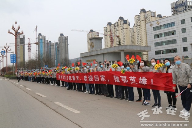 4月1日,天水市馳援湖北醫(yī)療隊返回秦州。二一三集團公司100余名職工整裝列隊,揮舞國旗、花束,熱情歡迎白衣勇士凱旋。