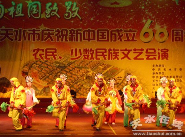 。ㄇ刂輩^(qū)委宣傳部 辛志鋒)7月24日下午,“向祖國致敬”天水市慶祝新中國成立60周年農(nóng)民、少數(shù)民族文藝匯演在68202部隊禮堂舉行,軍民共慶共和國60歲生日和“八一”建軍節(jié)。秦州區(qū)獲得了全市農(nóng)民文藝匯演優(yōu)秀組織獎,同時,選送的獨唱《多情的土地》、舞蹈《鞭桿舞》、舞蹈《天籟水影》獲得了優(yōu)秀獎,小品《村長開會》獲得唯一一等獎,將代表全市參加全省農(nóng)民文藝匯演。