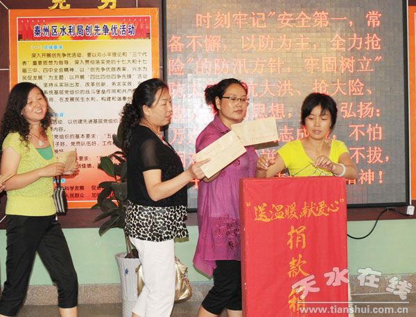 。ㄇ刂輩^(qū)水務(wù)局辦公室 王羿)8月26日,剛剛完成娘娘壩鎮(zhèn)災(zāi)區(qū)受損水利工程搶修任務(wù)的秦州區(qū)水務(wù)局供水工程搶修分隊(duì)隊(duì)員,一回到單位,大家就紛紛伸出援助之手,你100元,我50元,通過(guò)捐款的方式再次向受災(zāi)地區(qū)群眾送溫暖、獻(xiàn)愛(ài)心,短短半個(gè)小時(shí),全局干部職工就向?yàn)?zāi)區(qū)群眾捐善款13100元。