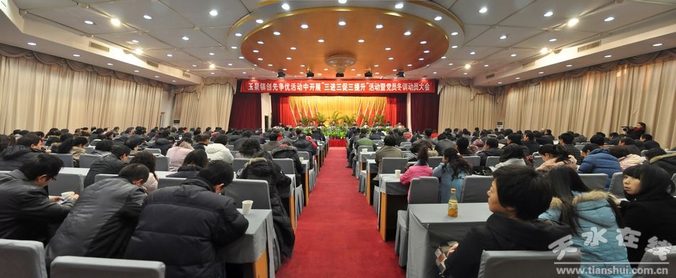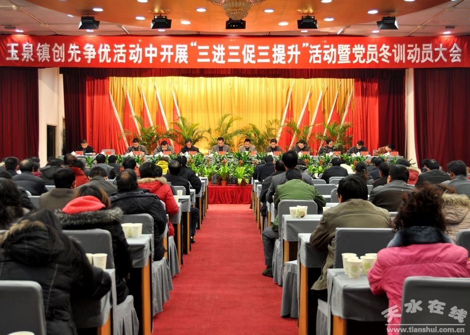 12月17日下午,秦州區(qū)玉泉鎮(zhèn)在市迎賓館召開“三進三促三提升”暨黨員冬訓動員大會,秦州區(qū)委下派工作隊全體成員、玉泉鎮(zhèn)黨委班子在家成員以及各村黨支部書記、副書記、村主任、副主任、文書、鎮(zhèn)屬單位負責人、全體鎮(zhèn)干部共310多人參加了當天的會議。秦州區(qū)委常委、玉泉鎮(zhèn)黨委書記李子園主持會議并作總結(jié)講話。