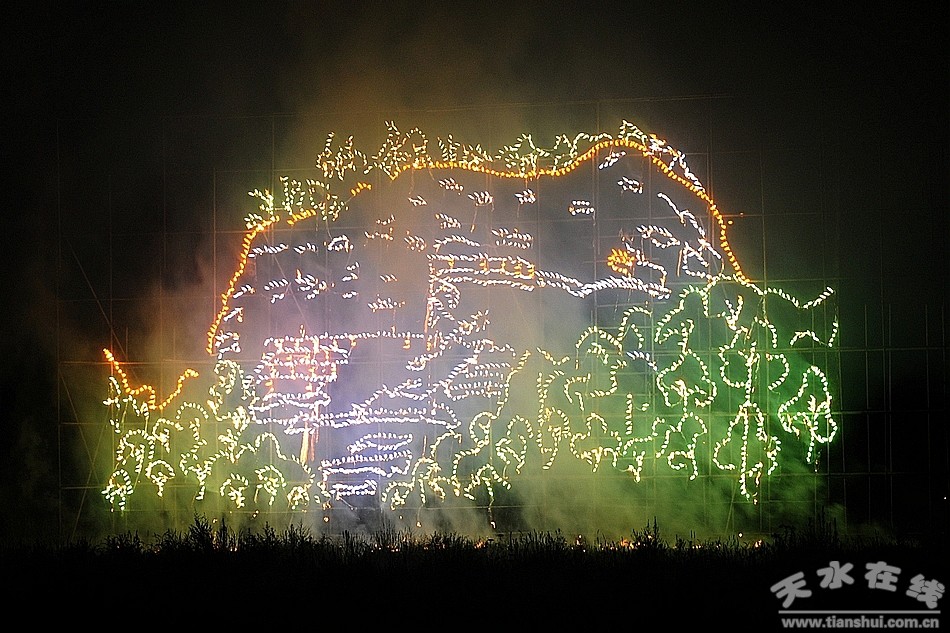 晚九點整,音樂焰火晚會正式拉開了序幕。綠牡丹、黃千輪、金波藍、色連珠花以及各式中空禮花,穿插特效花束、燭光、虎尾等組合電腦特技表演的效果,活力四射、青春律動、把和諧之美展示無余。絢爛的焰火爭奇斗艷,相互輝映,映亮了整個秦州夜空。