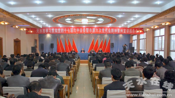 報(bào)告會(huì)上,高建蘭結(jié)合國(guó)際國(guó)內(nèi)形勢(shì),聯(lián)系我國(guó)經(jīng)濟(jì)社會(huì)和文化發(fā)展實(shí)際,從充分認(rèn)識(shí)十七屆六中全會(huì)的重大意義、中國(guó)共產(chǎn)黨人高度的文化自覺自信自強(qiáng)、堅(jiān)持中國(guó)特色社會(huì)主義文化發(fā)展道路建設(shè)文化強(qiáng)國(guó)、以改革為動(dòng)力興起社會(huì)主義文化建設(shè)新高潮等方面,深入系統(tǒng)地解讀了黨的十七屆六中全會(huì)精神。蒲曉光圍繞我市經(jīng)濟(jì)社會(huì)建設(shè)方面取得的主要成就,今后五年全市工作的總體要求、指導(dǎo)思想、基本原則、奮斗目標(biāo)、主要任務(wù)和重大舉措以及實(shí)施區(qū)域發(fā)展戰(zhàn)略、關(guān)中—天水經(jīng)濟(jì)區(qū)發(fā)展規(guī)劃、調(diào)整優(yōu)化經(jīng)濟(jì)結(jié)構(gòu)、統(tǒng)籌城鄉(xiāng)發(fā)展、協(xié)調(diào)發(fā)展社會(huì)事業(yè)、改善民生、提高黨的建設(shè)科學(xué)化水平等方面進(jìn)行了宣講輔導(dǎo)。
