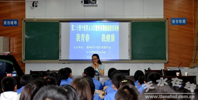7月10日,在第24個世界人口日來臨之際,秦州區(qū)石馬坪街道辦事處邀請區(qū)計生指導(dǎo)服務(wù)站專業(yè)人士,在轄區(qū)石馬坪中學(xué)舉辦了以“我青春、我健康”為主題的青少年青春期健康教育講座。講座圍繞青春期的生理和心理特點、青春期的保健、營養(yǎng)健康以及怎樣處理男女同學(xué)間的純潔友誼等內(nèi)容進行了詳實的講解,并通過多媒體課件演示、師生互動交流等形式,生動活潑地展示了有關(guān)青春期的科學(xué)知識,以科學(xué)的態(tài)度揭示了青少年在青春期生理和心理特點,讓學(xué)生正確地認識自己的生理、心理發(fā)展、變化規(guī)律。