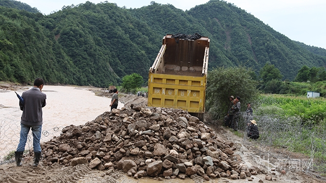▲在該段道路搶通現(xiàn)場,沿線村莊的群眾主動加入到搶通隊(duì)伍中,編制鐵絲籠,裝填石塊后對路基坡腳進(jìn)行加固。