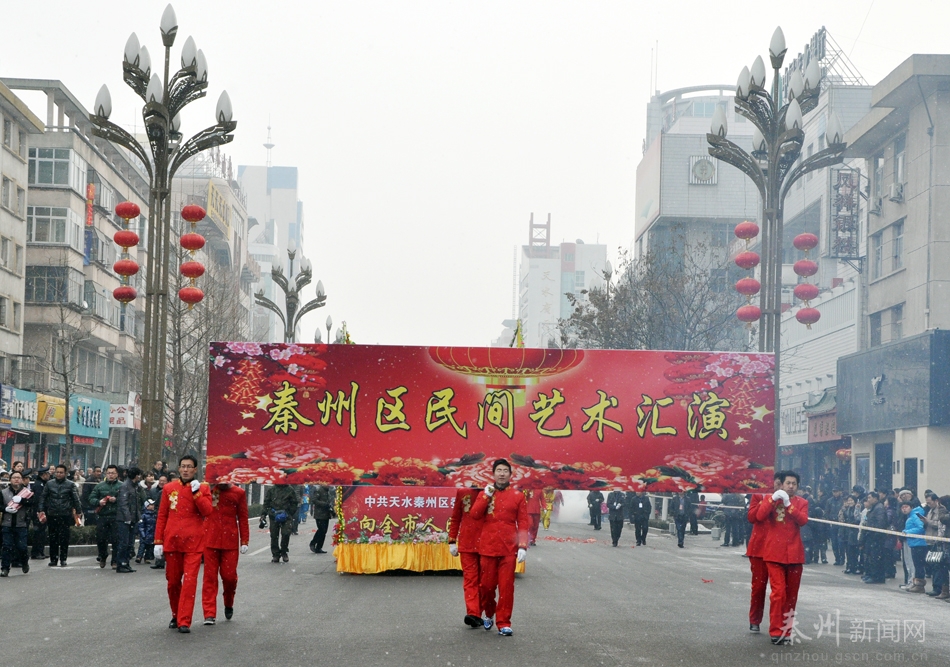 鑼鼓敲起來(lái),秧歌扭起來(lái),歡歌唱起來(lái)……2月11日,農(nóng)歷正月十二上午,秦州區(qū)街頭人頭攢動(dòng),熱鬧非凡,廣大市民興高采烈,沐浴著飄飄雪花,觀看秦州城鄉(xiāng)民間藝術(shù)匯演。