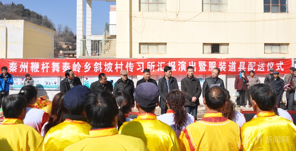 2月13日,省級非遺保護項目—秦州鞭桿舞秦嶺鄉(xiāng)斜坡村傳習所匯報表演暨表演服裝、道具、辦公設備配送儀式在秦嶺鄉(xiāng)舉行。
