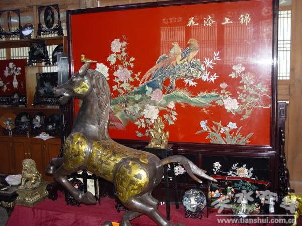 注重發(fā)揮市場(chǎng)作用,開(kāi)發(fā)特色非遺產(chǎn)品,飛天雕漆工藝在成功申報(bào)國(guó)家“非物質(zhì)文化遺產(chǎn)保護(hù)”名錄的基礎(chǔ)上,加大雕漆產(chǎn)品開(kāi)發(fā),將中國(guó)傳統(tǒng)漆器工藝與時(shí)代氣息相融合,采用金漆鑲嵌、磨漆出顯、平磨螺鈿、堆鼓彩繪、脫胎、刻漆、堆塑貼金、雕漆嵌玉等“八大裝飾工藝”,生產(chǎn)包括《百子圖》、《富貴長(zhǎng)春》等系列座屏,《金陵十二釵》、《群仙祝壽》等系列圍屏,《四季花鳥(niǎo)》、《四美圖》等系列掛屏以及花瓶、茶酒具、桌柜、首飾盒、手鐲等工藝品等在內(nèi)的1500多個(gè)花色品種,部分產(chǎn)品被中國(guó)工藝美術(shù)館、人民大會(huì)堂、同濟(jì)大學(xué)等國(guó)家有關(guān)部門(mén)及省、市單位收藏陳列。2015年創(chuàng)新研發(fā)的實(shí)用型雕漆精品生產(chǎn)線技改項(xiàng)目被列入本年度全國(guó)絲綢之路文化產(chǎn)業(yè)重點(diǎn)項(xiàng)目庫(kù)。成立鄉(xiāng)村記憶博物館和天水雕漆博物館,設(shè)置“詩(shī)禮傳家館”、“農(nóng)耕文化館”、“耕讀人家館”和“童趣體驗(yàn)館”五個(gè)展廳,展廳兩側(cè)為動(dòng)態(tài)展演區(qū)和特色文化產(chǎn)品展示區(qū),大小展品1500余件,全面展示全區(qū)非遺保護(hù)情況、非遺產(chǎn)品研發(fā)和文化產(chǎn)業(yè)。突出對(duì)天水絲毯織造技藝、泥塑、竹雕、古琴制造等非遺技藝的傳承研發(fā),開(kāi)發(fā)吳氏女紅荷包、趙氏泥人、“浡云齋”竹雕、“熊氏古琴”、春風(fēng)集團(tuán)羊絨圍巾、“詩(shī)圣萍蹤”寫(xiě)生、《伏羲廟》磚雕等地域特色鮮明的非遺產(chǎn)品,著力打造秦州非遺產(chǎn)品品牌。