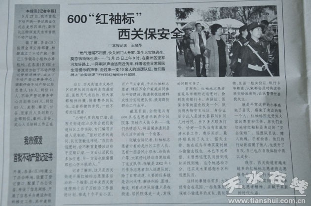近年來(lái),西關(guān)街道按照推選十個(gè)平安小區(qū)、百戶平安家庭、千名紅袖標(biāo)志愿者、轄區(qū)萬(wàn)余戶家庭共同參與平安建設(shè)“十百千萬(wàn)”平安建設(shè)推進(jìn)計(jì)劃,積極組建群眾性治安巡邏隊(duì)伍,提高群防群治工作水平。截至目前,全街道已有600多名志愿者,他們中有社區(qū)工作人員、有居民小組長(zhǎng)、有沿街商戶代表,更有熱心的小區(qū)居民,大家經(jīng)過(guò)培訓(xùn)自愿組成了這支隊(duì)伍。他們穿梭在大街小巷熱情助人,幫扶居民,更像一個(gè)個(gè)“活探頭”,及時(shí)捕捉發(fā)現(xiàn)身邊的安全隱患,將溫暖與安全滲透到居民生活的每一個(gè)角落。聚寶盆社區(qū)居民馬恒基作為志愿者加入社區(qū)巡邏隊(duì),除了日常巡邏,主要的任務(wù)就是訪問(wèn)民情,解決糾紛、困難,對(duì)一些特殊人群進(jìn)行跟蹤,將情況及時(shí)反饋給社區(qū)。有一次,他在巡邏途中,發(fā)現(xiàn)靠近路邊的聚寶盆小區(qū)有人要跳樓,第一時(shí)間撥打110報(bào)警,同時(shí)發(fā)動(dòng)周圍商鋪、鄰居找來(lái)棉被和氣墊,做好應(yīng)急救助。后來(lái)了解到,跳樓人是因患有精神抑郁癥,一時(shí)想不開,所幸發(fā)現(xiàn)及時(shí),才未釀成大禍。就是平常這樣的點(diǎn)點(diǎn)滴滴感染著居民,感染著身邊的每一個(gè)人,紅袖標(biāo)因此受到大家的尊重和信任,居民們因此親切地稱紅袖標(biāo)是身邊的安全“保姆”。西關(guān)街道的“紅袖標(biāo)”志愿者,天水晚報(bào)作為“今日推薦”做了專題報(bào)道。