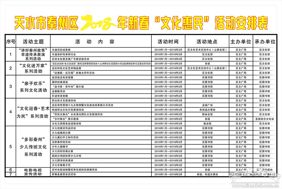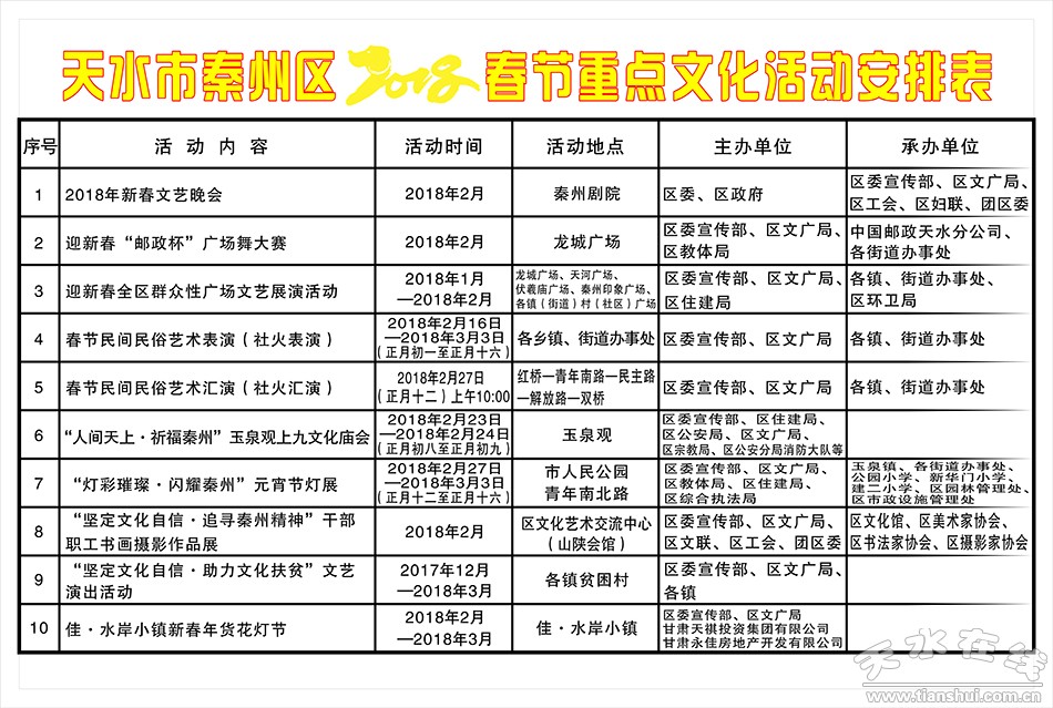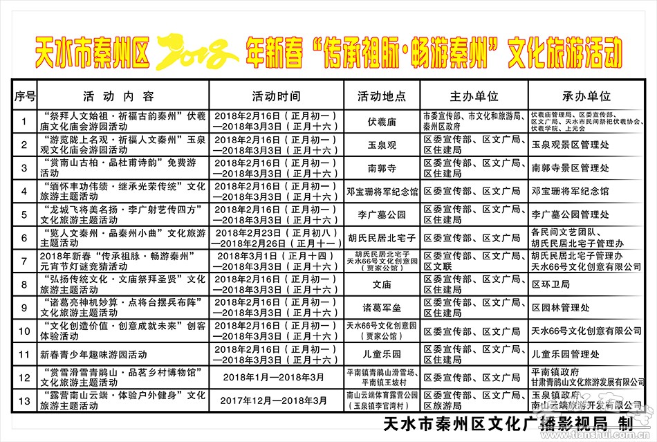 今年新春文化活動(dòng)共分元旦重點(diǎn)文化活動(dòng)、春節(jié)重點(diǎn)文化活動(dòng)、新春“文化惠民”活動(dòng)和“傳承祖脈·暢游秦州”文化旅游活動(dòng)四大類。歷來最受廣大市民矚目的社火匯演和元宵節(jié)燈展,將作為春節(jié)文化活動(dòng)的重頭戲,在2月27日集體亮相。