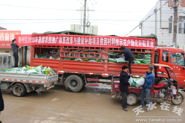 為穩(wěn)步推進(jìn)基層農(nóng)技推廣體系改革與建設(shè)補(bǔ)助項(xiàng)目,調(diào)動(dòng)科技示范主體應(yīng)用農(nóng)業(yè)新技術(shù)的積極性,發(fā)揮示范帶動(dòng)作用,助力脫貧攻堅(jiān),3月25日,秦州區(qū)農(nóng)業(yè)農(nóng)村局積極開(kāi)展貧困村科技示范戶物化補(bǔ)貼發(fā)放活動(dòng),舉辦了農(nóng)作物春季田間管理技術(shù)培訓(xùn)會(huì)暨肥料發(fā)放儀式,為全區(qū)84個(gè)建檔立卡貧困村252戶科技示范戶免費(fèi)發(fā)放補(bǔ)貼肥料100.8噸。