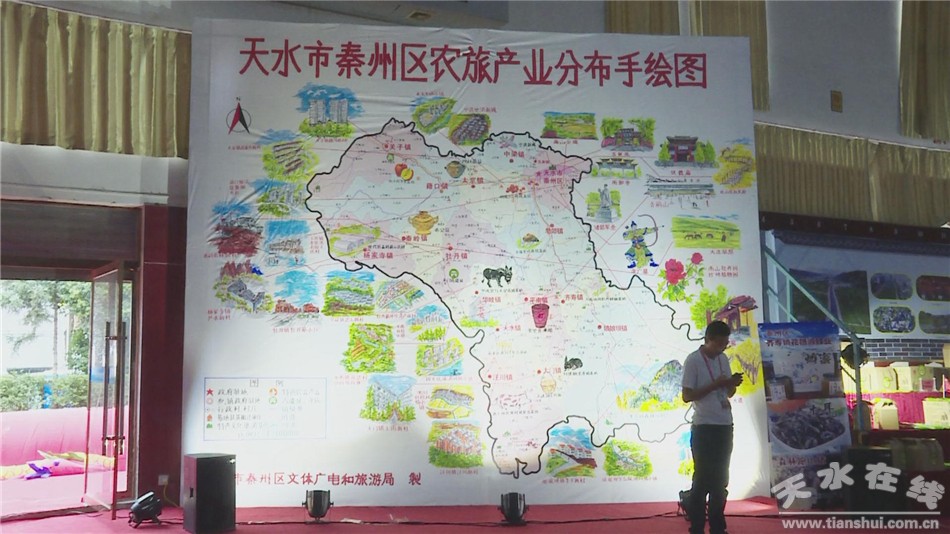 記者走進(jìn)農(nóng)旅產(chǎn)品展會,看到展館左邊有一副高5米,寬6米的秦州區(qū)農(nóng)旅產(chǎn)業(yè)分布圖,這張圖用手繪的方式,標(biāo)出了秦州區(qū)易地扶貧搬遷、特色文化旅游景點(diǎn)、特色農(nóng)產(chǎn)品的分布情況,全面宣傳推介秦州旅游文化、精準(zhǔn)扶貧成果。