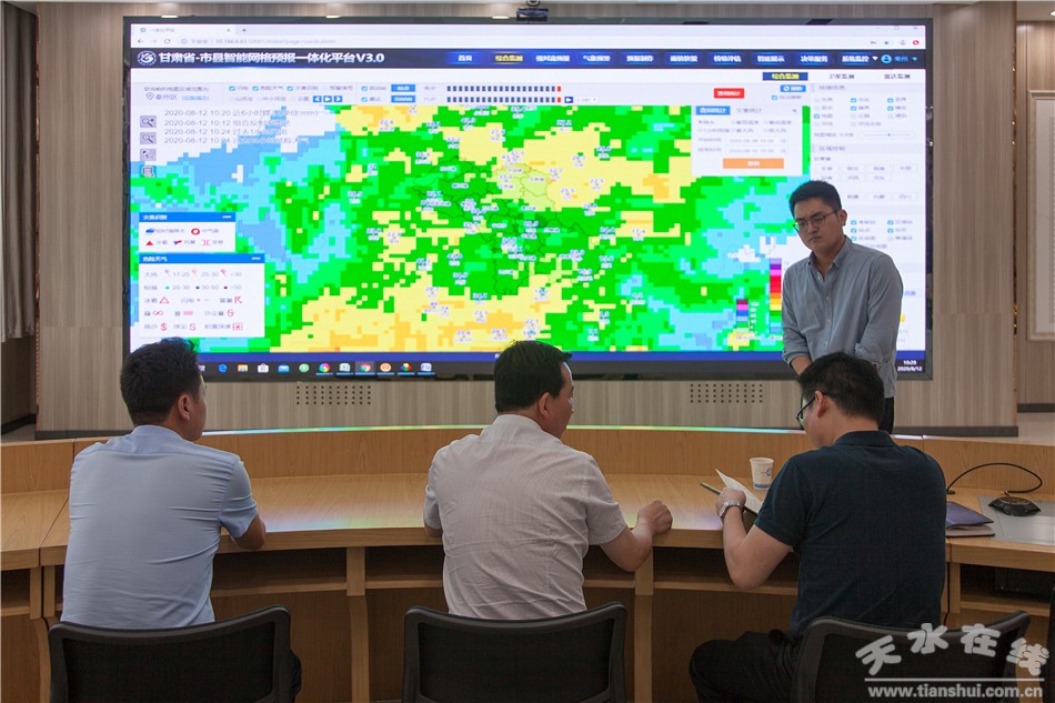 孟曉龍一行通過氣象部門智能網(wǎng)格預(yù)報(bào)一體化平臺(tái),詳細(xì)了解雨帶的分布和走勢、各區(qū)域自動(dòng)站點(diǎn)雨量數(shù)據(jù)情況。