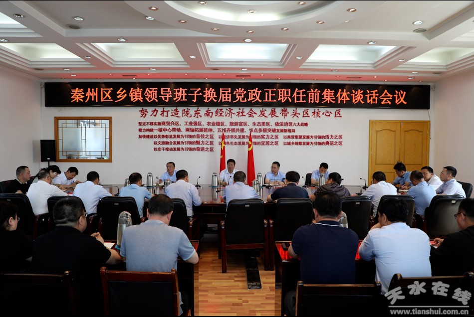 秦州區(qū)融媒體中心6月10日訊(記者 邵千)6月10日,秦州區(qū)召開(kāi)鄉(xiāng)鎮(zhèn)領(lǐng)導(dǎo)班子換屆黨政正職任前集體談話會(huì)議,市委常委、區(qū)委書(shū)記王東紅出席會(huì)議并講話,他強(qiáng)調(diào),新調(diào)整干部要有正確的態(tài)度和認(rèn)識(shí),牢記自身承擔(dān)的使命,盡快進(jìn)入角色,認(rèn)真履行職責(zé),振奮精神,不負(fù)重托,努力在新的起點(diǎn)上創(chuàng)造新的業(yè)績(jī),為推動(dòng)“十四五”開(kāi)好局起好步和全面推進(jìn)鄉(xiāng)村振興作出新的更大貢獻(xiàn)。