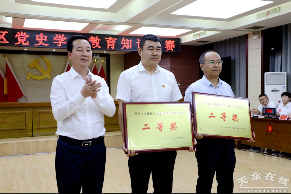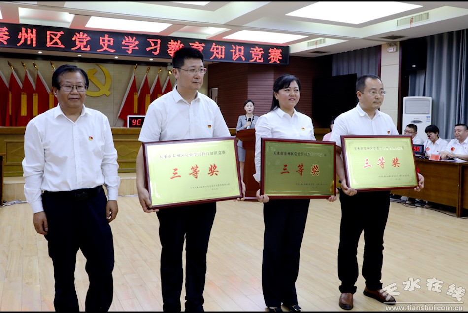 秦州區(qū)融媒體中心6月25日訊(記者 楊旭 邵千)6月25日,秦州區(qū)舉辦黨史學(xué)習(xí)教育知識(shí)競(jìng)賽,市委常委、區(qū)委書(shū)記王東紅,區(qū)委副書(shū)記、區(qū)長(zhǎng)孟曉龍,區(qū)人大常委會(huì)主任魏勝奎,區(qū)政協(xié)主席毛更生觀看比賽并為獲獎(jiǎng)隊(duì)伍頒獎(jiǎng)。