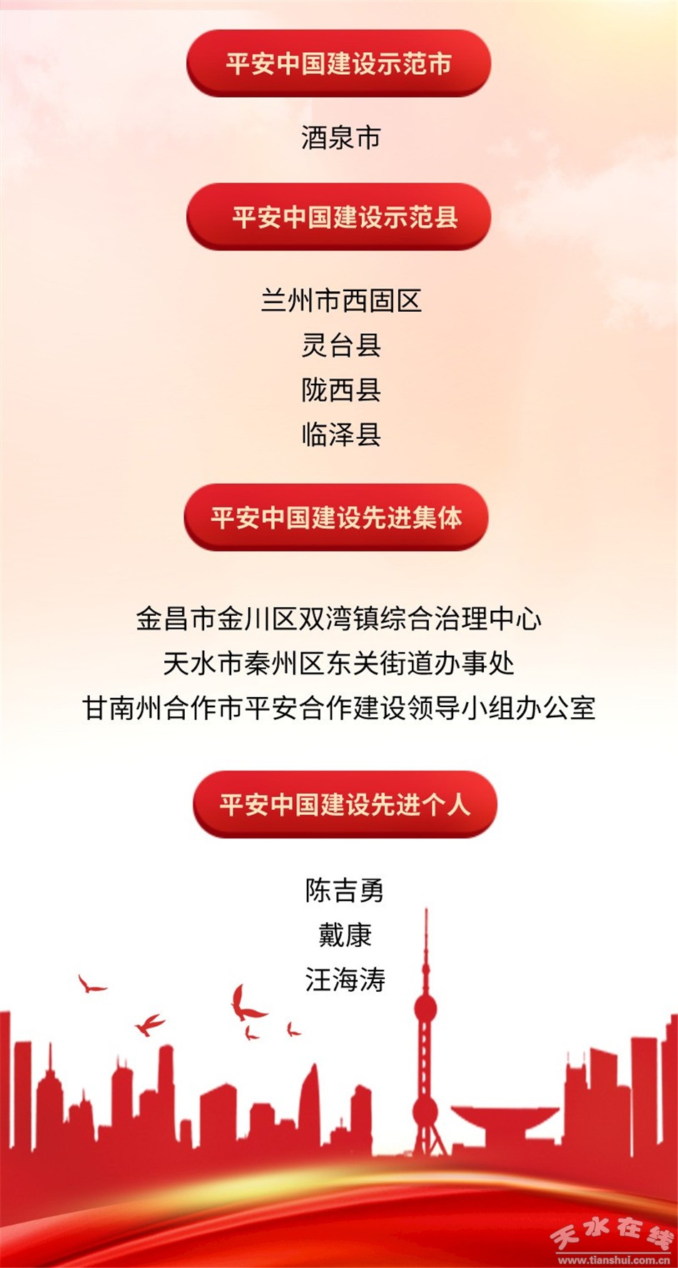 其中,金昌市金川區(qū)雙灣鎮(zhèn)綜合治理中心、天水市秦州區(qū)東關(guān)街道辦事處、甘南州合作市平安合作建設(shè)領(lǐng)導(dǎo)小組辦公室獲評平安中國建設(shè)先進集體。