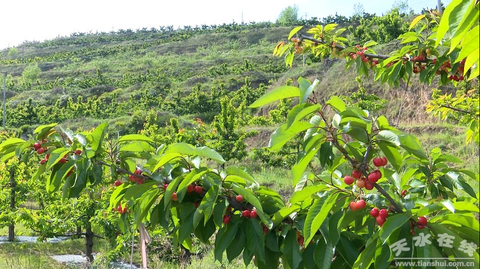小滿時(shí)節(jié),秦州區(qū)露天種植的紅燈、意大利早紅等大櫻桃品種陸續(xù)成熟,進(jìn)入采摘期。在皂郊鎮(zhèn)秀金山的萬畝大櫻桃種植基地,成片的櫻桃樹布滿了整個(gè)山坡。來到櫻桃樹前,晶瑩剔透的大櫻桃,沉甸甸地掛滿枝頭。