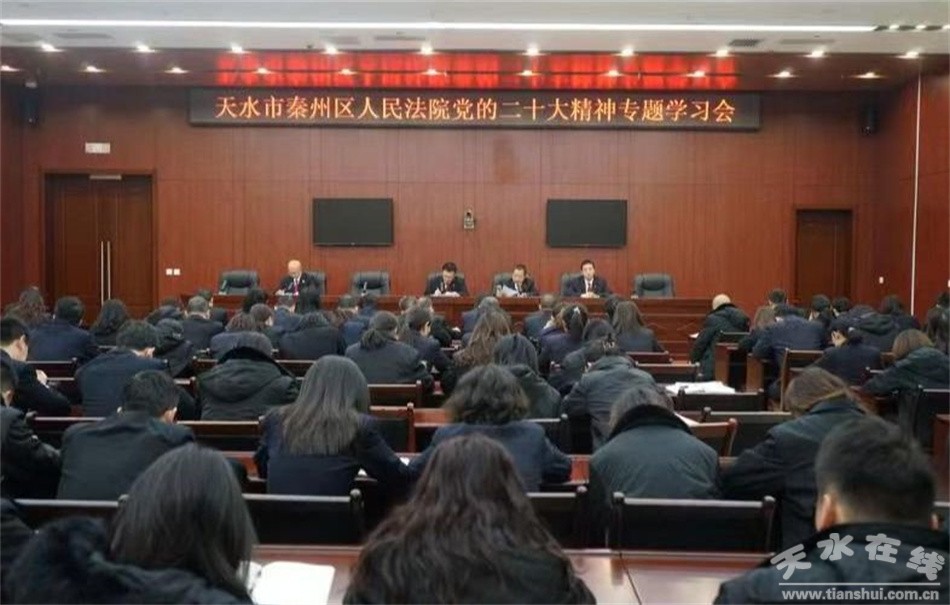秦州區(qū)人民法院組織全院干警專題學(xué)習(xí)黨的二十大精神。會(huì)議強(qiáng)調(diào),全院要深入學(xué)習(xí)貫徹黨的二十大精神,切實(shí)履行好維護(hù)國(guó)家安全、社會(huì)安定、人民安寧的重大責(zé)任,堅(jiān)持服務(wù)大局、司法為民、公正司法,為建設(shè)幸福美好新秦州提供有力司法服務(wù)和保障。要牢牢堅(jiān)持黨對(duì)人民法院工作的絕對(duì)領(lǐng)導(dǎo),切實(shí)增強(qiáng)政治判斷力、政治領(lǐng)悟力、政治執(zhí)行力,堅(jiān)持多形式、全覆蓋學(xué)習(xí)宣傳貫徹黨的二十大精神。要深刻領(lǐng)悟“兩個(gè)確立”的決定性意義,增強(qiáng)“四個(gè)意識(shí)”、堅(jiān)定“四個(gè)自信”、做到“兩個(gè)維護(hù)”,切實(shí)將黨中央和省市區(qū)委決策部署貫徹落實(shí)到法院各項(xiàng)工作中。要全面加強(qiáng)審判執(zhí)行工作,充分發(fā)揮法治固根本、穩(wěn)預(yù)期、利長(zhǎng)遠(yuǎn)的保障作用,積極助力法治秦州建設(shè)。堅(jiān)定不移貫徹總體國(guó)家安全觀,依法懲治犯罪、保護(hù)人民、定紛止?fàn)帯⒒饷,常態(tài)化開(kāi)展掃黑除惡,有力維護(hù)國(guó)家安全和社會(huì)穩(wěn)定。要正確貫徹實(shí)施憲法法律,促進(jìn)行政爭(zhēng)議實(shí)質(zhì)性化解,服務(wù)法治秦州建設(shè)。堅(jiān)持以人民為中心,維護(hù)最廣大人民根本利益,讓人民群眾的獲得感、幸福感、安全感更加充實(shí)、更有保障、更可持續(xù)。要持之以恒推進(jìn)全面從嚴(yán)管黨治警,嚴(yán)格落實(shí)新時(shí)代政法干警“十個(gè)嚴(yán)禁”,持續(xù)狠抓防止干預(yù)司法“三個(gè)規(guī)定”落實(shí),不斷完善考核評(píng)價(jià)機(jī)制,充分激發(fā)全院干警干事創(chuàng)業(yè)的積極性,努力打造一支黨和人民信得過(guò)、靠得住、能放心的法院鐵軍。