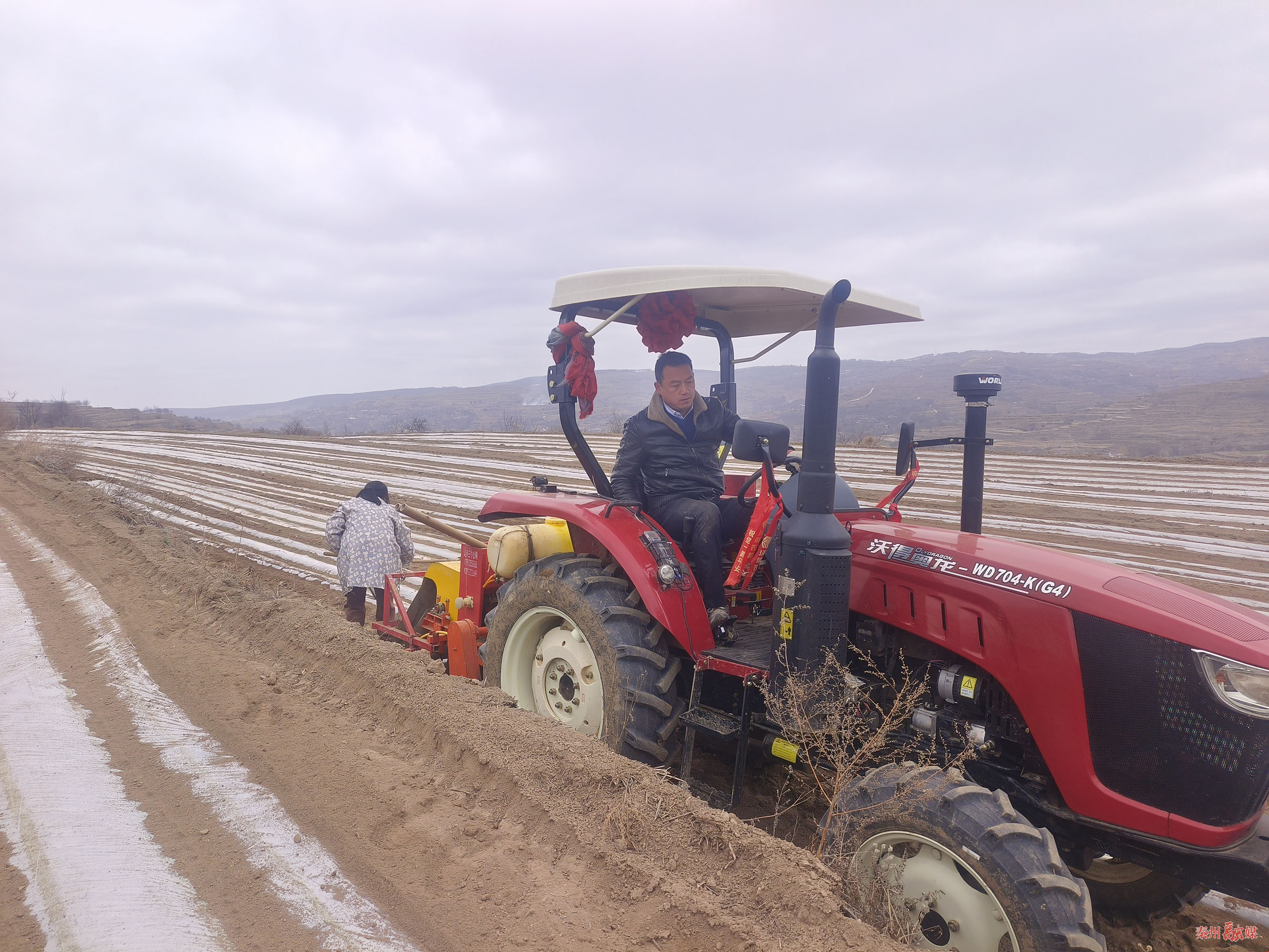 走進天水鎮(zhèn)石徐村千畝頂凌覆膜基地,數(shù)臺新型覆膜機穿梭田間,銀白色地膜如流水般鋪展開來。其中一臺無人駕駛的玉米雙壟溝全覆膜聯(lián)合作業(yè)機在北斗導(dǎo)航的引導(dǎo)下,正在精準作業(yè),整卷地膜通過傳送裝置被平整地鋪蓋在田地中,再由壓膜裝置均勻地壓成三行種植帶,犁溝覆膜壓土一體成型,整個操作過程中,最大偏差度精準控制在1厘米至2厘米之間。