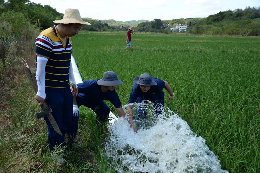 2022年8月20日,湖南省衡陽(yáng)市應(yīng)急綜合救援大隊(duì)出動(dòng)兩個(gè)中隊(duì)的指戰(zhàn)員、一臺(tái)大型排澇車,帶著4臺(tái)大功率抽水設(shè)備,在耒陽(yáng)市壇下鄉(xiāng)投入抗旱救災(zāi)。新華社記者明星攝