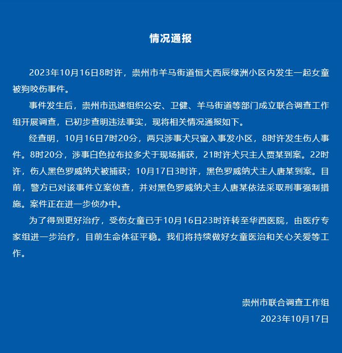 據(jù)“今日崇州”微信公眾號(hào)消息,四川崇州市聯(lián)合調(diào)查工作組17日發(fā)布通報(bào)稱,10月16日8時(shí)許,四川崇州市羊馬街道恒大西辰綠洲小區(qū)內(nèi)發(fā)生一起女童被狗咬傷事件。事件發(fā)生后,崇州市迅速組織公安、衛(wèi)健、羊馬街道等部門成立聯(lián)合調(diào)查工作組開展調(diào)查,已初步查明違法事實(shí),現(xiàn)將相關(guān)情況通報(bào)如下。
