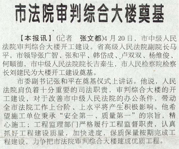 市委副書記張和平在奠基儀式上講話。他說,人民法院肩負著十分重要的司法職責,審判綜合大樓的開工建設(shè),對于改善市中級人民法院的辦公條件,帶動全市法院工作上臺階、上水平將產(chǎn)生積極影響。他希望施工單位秉承“安全第一、質(zhì)量第一”的宗旨,精心施工;工程監(jiān)理部門嚴格履行工程監(jiān)督職責,認真抓好工程建設(shè)質(zhì)量,加快進度,保質(zhì)保量按期完成工程建設(shè)。力爭把市法院審判綜合大樓建成優(yōu)質(zhì)工程。