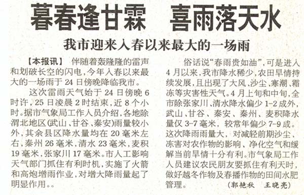 這次雷雨天氣始于24日傍晚6時(shí)許,25日凌晨2時(shí)結(jié)束,近8個(gè)小時(shí)。據(jù)市氣象局工作人員介紹,各地除渭北地區(qū)(武山、甘谷、秦安)雨量較小外,其余縣區(qū)降水量均在20毫米左右,秦州26毫米,清水23毫米,麥積19毫米,張家川17毫米。市人工影響天氣部門(mén)抓住有利時(shí)機(jī),實(shí)施了火箭和高炮增雨作業(yè),對(duì)增大降雨量起了明顯作用。