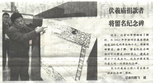 近日,記者從市博物館了解到,從2003年開始對伏羲廟捐款超過500元的單位和個人,將被刻碑留名。據(jù)了解,留名紀念石碑預(yù)計可以留名4000多人,建成后將立于伏羲廟內(nèi),成為甘肅境內(nèi)最大的一塊捐款紀念碑。