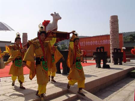本報天水訊(記者王蘭芳)7月3日上午,天水市伏羲祭祀廣場龍旗獵獵,鼓樂齊鳴,由省政府和華夏文化紐帶工程組委會主辦、天水市政府承辦的2006(丙戌)年公祭中華人文始祖伏羲大典在這里隆重舉行。此次公祭是伏羲祭典被列入首批國家級非物質(zhì)文化遺產(chǎn)名錄后的首次亮相。來自海內(nèi)外的華人華僑、港澳臺同胞、天水各界群眾和部分國際友人共上萬人參加了祭祀活動。