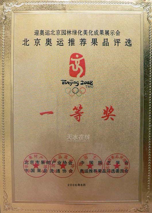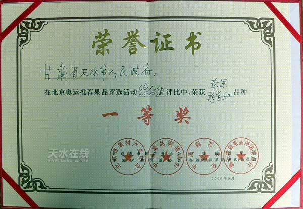 花牛蘋果自1965年出口香港與美國蛇果競爭取勝以來,屢獲殊榮。經(jīng)過40多年的發(fā)展,已陸續(xù)引進(jìn)和培育了“栽培2號”、“天汪1號”、“新紅星”、“超紅”等元帥系3至5代優(yōu)良新品種。迄今新品種栽培面積占80%以上。新技術(shù)的推廣與普及,使花牛蘋果在保持原有風(fēng)味的同時,以其色艷味醇、果形高樁、五棱突出、營養(yǎng)豐富的特色享譽(yù)國內(nèi)外市場。今年9月6日,在北京奧運(yùn)推薦果品的評選中,花牛蘋果與秦安蜜桃榮獲奧運(yùn)推薦果品的五個一等獎,并獲得“中華名果”稱號。這是天水果品獲得的最權(quán)威、最廣泛、最高層次和最大規(guī)模的獎項(xiàng),為宣傳我市“花牛蘋果”等優(yōu)勢名牌果品,擴(kuò)大國內(nèi)外市場占有率,摘下了金字招牌。