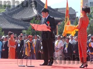 在這場盛況空前的祭祀儀式中,有一位身著紅裝、靚麗的身影不時穿梭在人群中,主要的禮儀接待工作都是由她來完成的。她,就是就讀于天津商業(yè)大學(xué)的21歲天水姑娘王子婷。當(dāng)伏羲祭祀儀式開始時,她鎮(zhèn)定自若,款款大方地引領(lǐng)著中央、省、市領(lǐng)導(dǎo)緩緩步入伏羲廣場,成為最先進(jìn)入各媒體眼中的一顆“小星星”。當(dāng)宣讀祭文時,她又為領(lǐng)導(dǎo)呈上祭文,禮儀規(guī)范,毫無差錯。她的從容不迫和落落大方,贏得了圍觀觀眾的贊賞。
