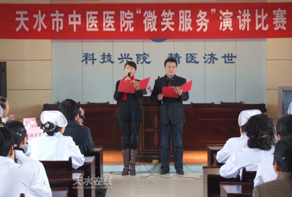 為了深入貫徹落實天水市衛(wèi)生局黨委關(guān)于《醫(yī)療衛(wèi)生單位窗口崗位樹立微笑服務(wù)決定》的文件精神,進(jìn)一步增強(qiáng)醫(yī)務(wù)人員的服務(wù)宗旨意識,構(gòu)建和諧醫(yī)患關(guān)系。天水市中醫(yī)醫(yī)院于2007年12月6日舉辦了以“微笑服務(wù)”為主題的演講比賽活動。這次活動邀請了團(tuán)市委、市衛(wèi)生局領(lǐng)導(dǎo)以及行評代表參加并擔(dān)當(dāng)評委。演講現(xiàn)場氣氛熱烈,演講事跡感人,高潮迭起。